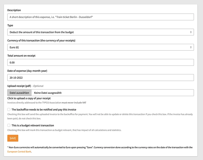 - This is a budget relevant transaction: Define if the transaction is a change for the budget itself. If you want to change the height of the budget, then please aktivate this option (only available for Budget Managers of TYPO3 Association)