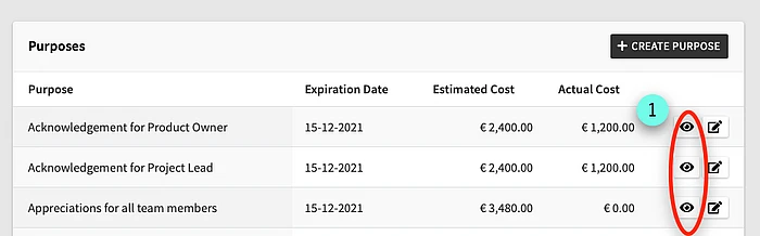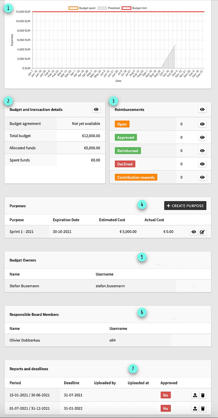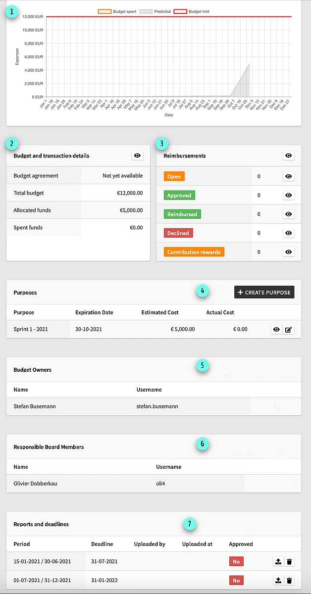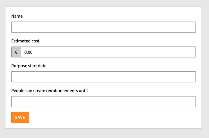 - Purpose: Each reimbursement needs a purpose. They are used to provide a clear structure for the budget and offer more transperency. You also limit a purpose to specific users.