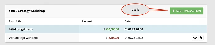 - Budget and transaction details: An overview about numbers of this budget. You can add manual transactions for this budget.