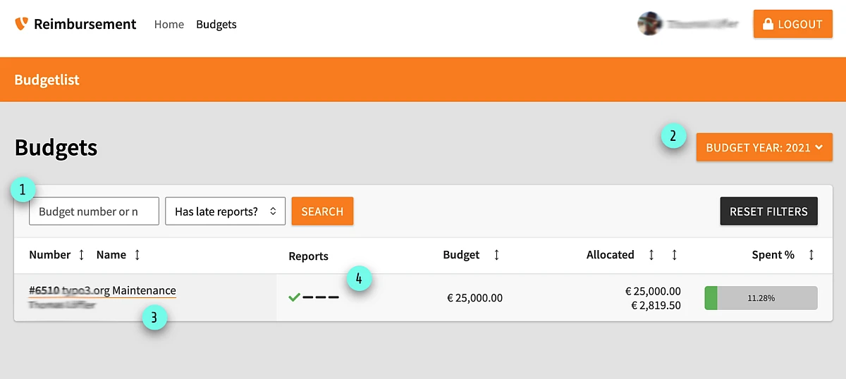 - Filter area: Filter by name or budget number - you can also filter by those budget who do have late reports